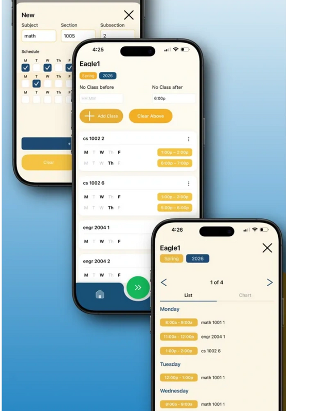 Manually add information for classes you would potentially have for a schedule. Subject, section and subsection for each class are typed-in, and their respective days and times are push buttons.